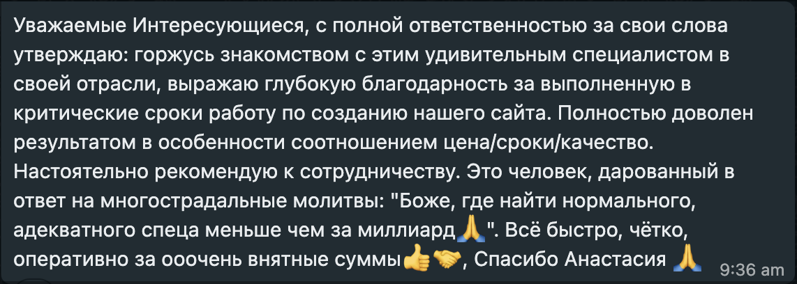 Что не входит в стоимость: *покупка домена (от 199 руб. - reg.ru) **оплата аккаунта на Tilda (от 750 руб/мес или от 6.000 руб/год - tilda.cc) подключение сторонних сервисов - доставка, рассылка, бронирование и т.д.